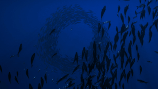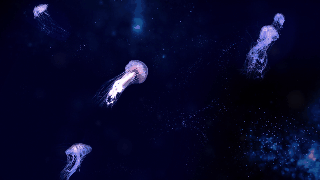 海流導(dǎo)致魚群橫行,大鯨魚在大海上悠閑地覓食,水母飄逸地游動著,散發(fā)著光芒,各種生物一起展示著大海下的日常生活。